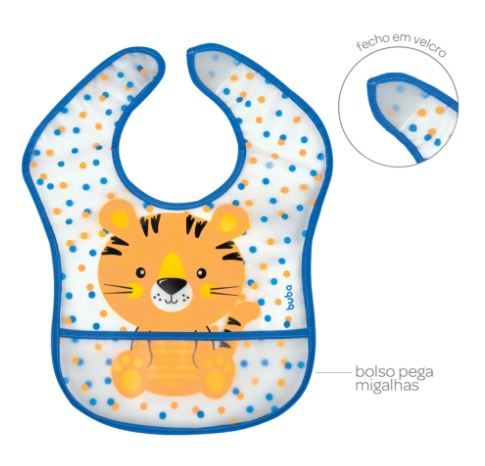 Possui bolso frontal com cata migalhas e fechamento em velcro que se ajusta ao pescoço do bebê.